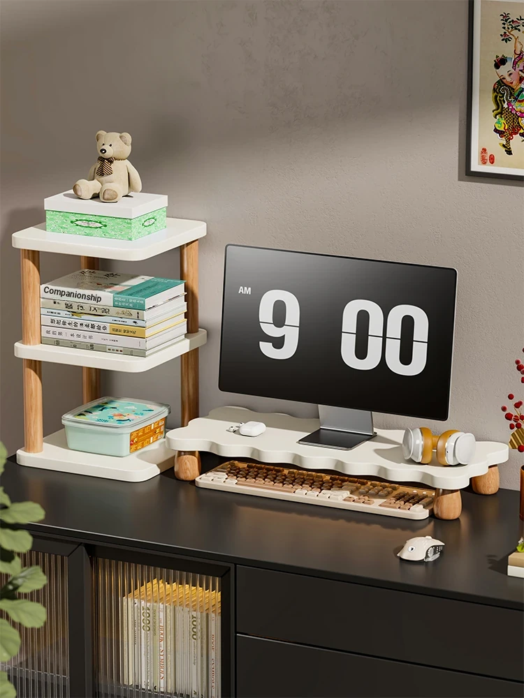 Solid Wood Monitor Stand - Adjustable Height Desktop Display Riser with Multi-Layer Storage Organizer for Office Use, Enhances Workspace Efficiency and Comfort