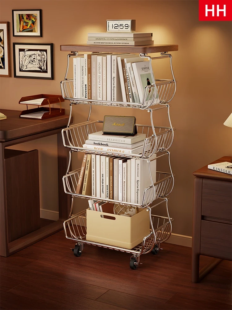 移動式ヴィンテージ多層ブックシェルフ|おしゃれなデザインで書斎をもっと素敵に!キャスター付きで簡単移動、書籍整理もスムーズに!あなたの本をスタイリッシュに収納する完璧なアイテムです。