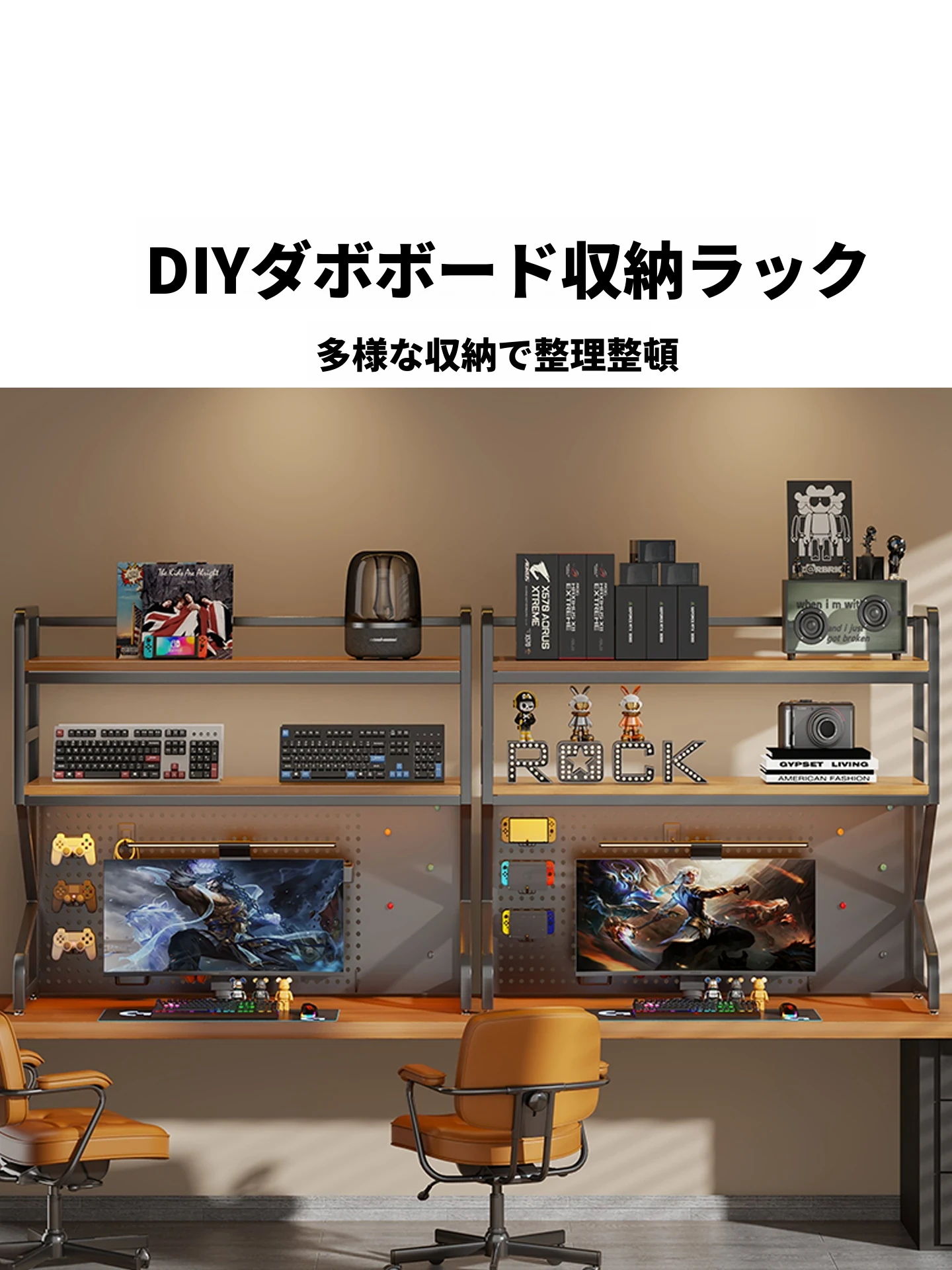 ゲームルームに最適!デザイン性と機能性を兼ね備えた穴あきボード収納ラック - ダブルデスク用アイアン製収納シェルフ。学生用デスクやパソコンデスクにもぴったりな多層型ラック!
