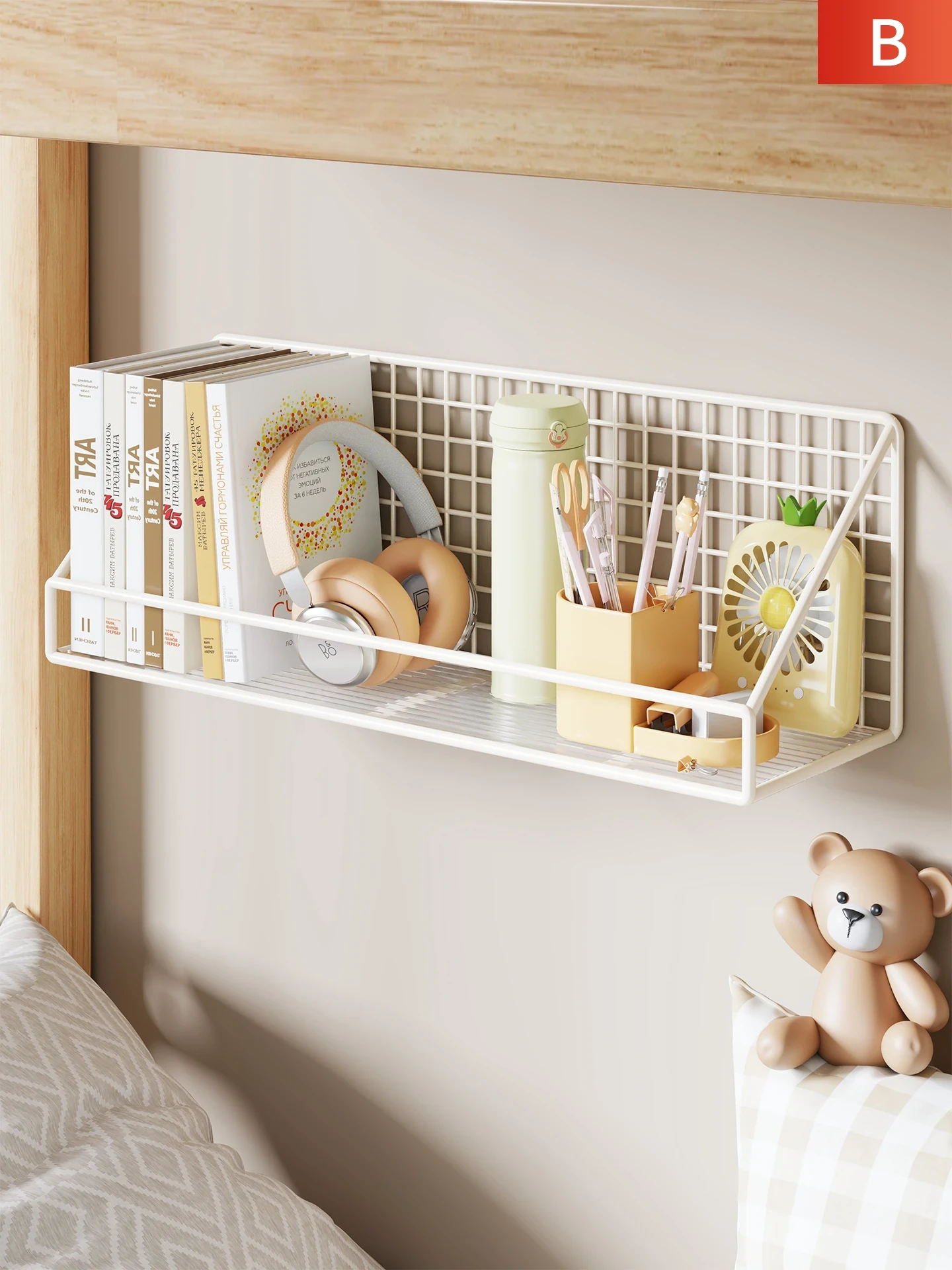 学生生活を便利にする!壁掛け式収納ラック - 寝室や寮で使える、ベッドサイドにぴったりの収納バスケット。上段用にも最適なアイテムで、スッキリとした空間を実現します。